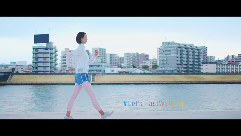 動画では、前向きな言葉をナレーションで伝えつつ、軽やかなトーンで明るくポジティブな世界観に仕上げ、テロップはグラフィックチームが動画の世界観になじむよう細部にもこだわり作成。イメージキャラクターとして出演されている畠山愛理さんが、色々な場所をぐんぐん歩いていくシーンをメインにしたPV調の構成で「Fast Walking」の魅力と特徴を伝えています。